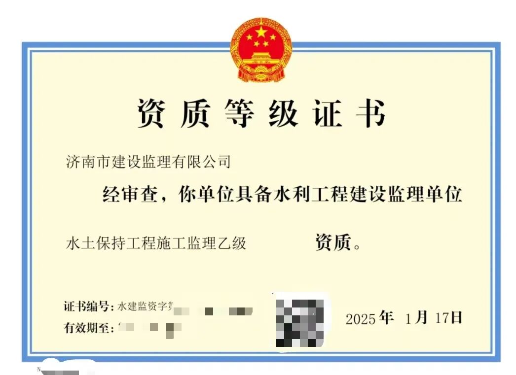 二〇二五年一月,经水利部批准,我公司同时取得水利工程施工监理乙级资质及水土保持工程施工监理乙级资质。这是我公司在取得工程监理综合资质后,又获得的住建部管理范畴之外的从业资格,为公司经营业务开辟新的领域,为公司业务类型的拓展提供新的平台,也为公司持续、快速发展奠定了坚实基础。